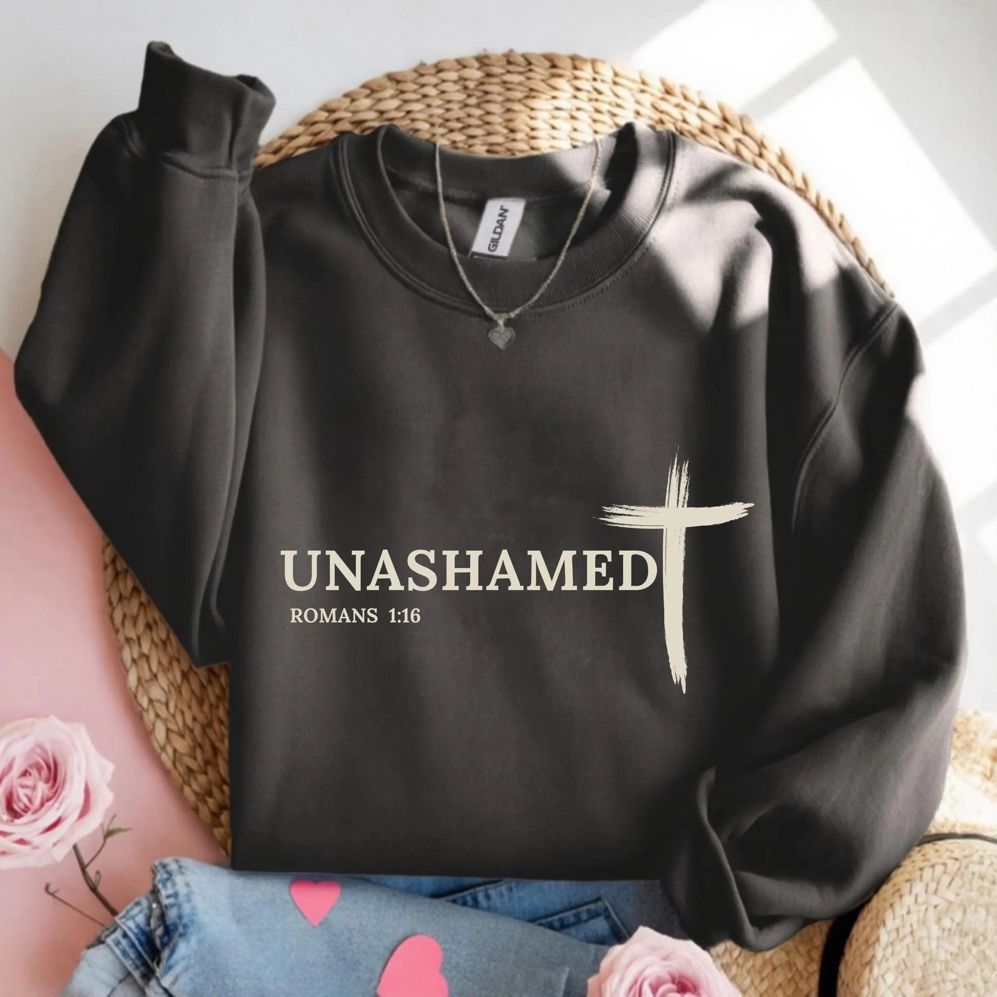 Declare your faith boldly with this Christian Romans 1:16 Sweatshirt. Featuring the powerful word “UNASHAMED” alongside a stylized cross and the verse reference Romans 1:16, this pullover is a statement of conviction and courage.